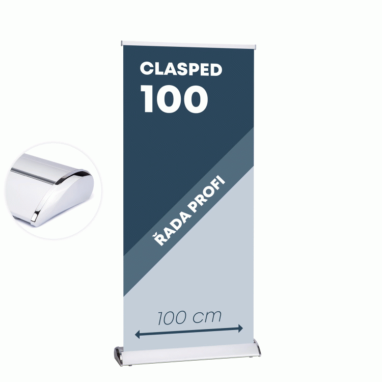 Rollup CLASPED 100 je jeden z největších námi nabízených profi rollup systémů. Mezi hlavní výhody toho prezentačního systému patří nadčasový luxusní design a možnost rychlé a jednoduché výměny banneru pomocí zacvakávacího systému v horní i spodní části.