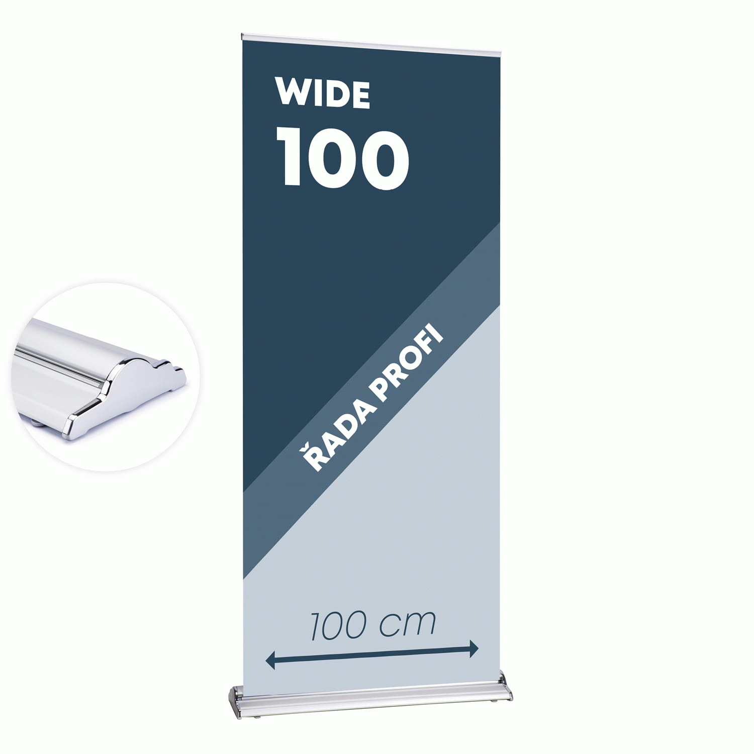 Rollup WIDE 100 spadá do kategorie profesionálních rollupů a je vhodný pro časté používání. Zesílená symetrická konstrukce z něj dělá pevný a těžký rollup systém s výbornou stabilitou. Pro snadnou, pohodlnou a rychlou výměnu banneru s grafikou slouží zacvakávací systém ve spodní i horní části.