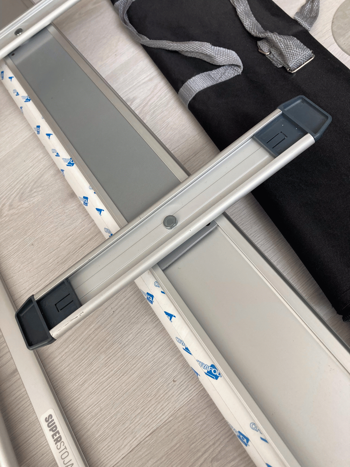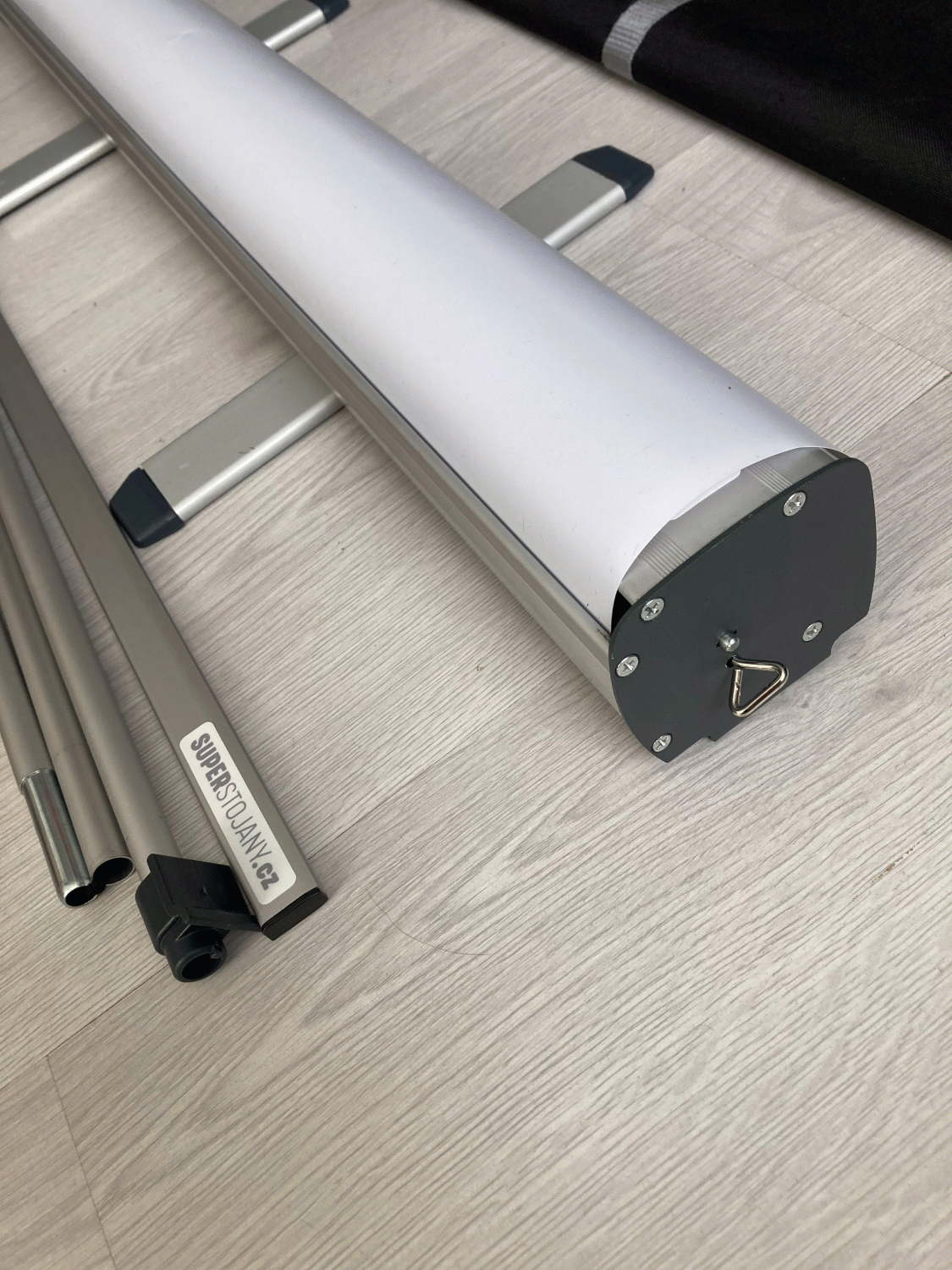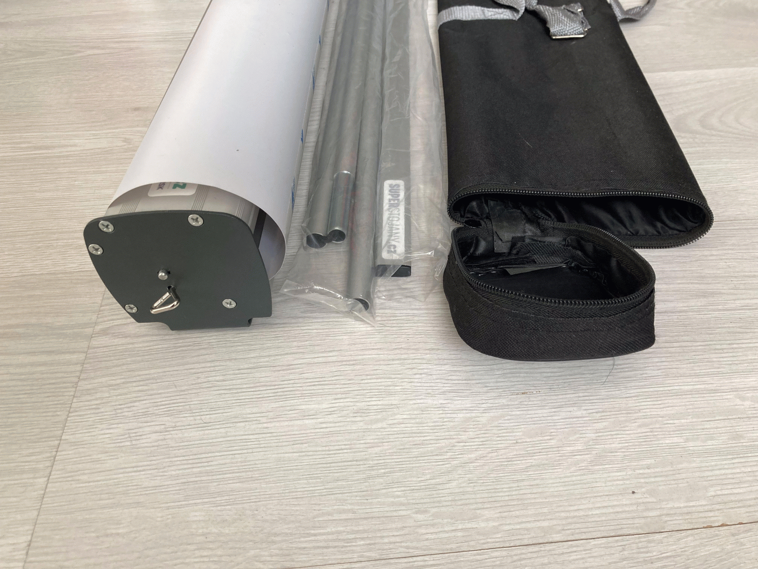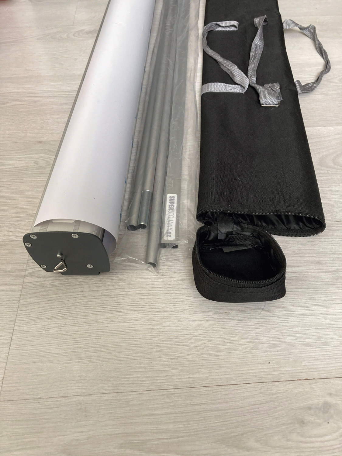 Součástí je rollup systém, lišta, podpěrná tyč a taška.