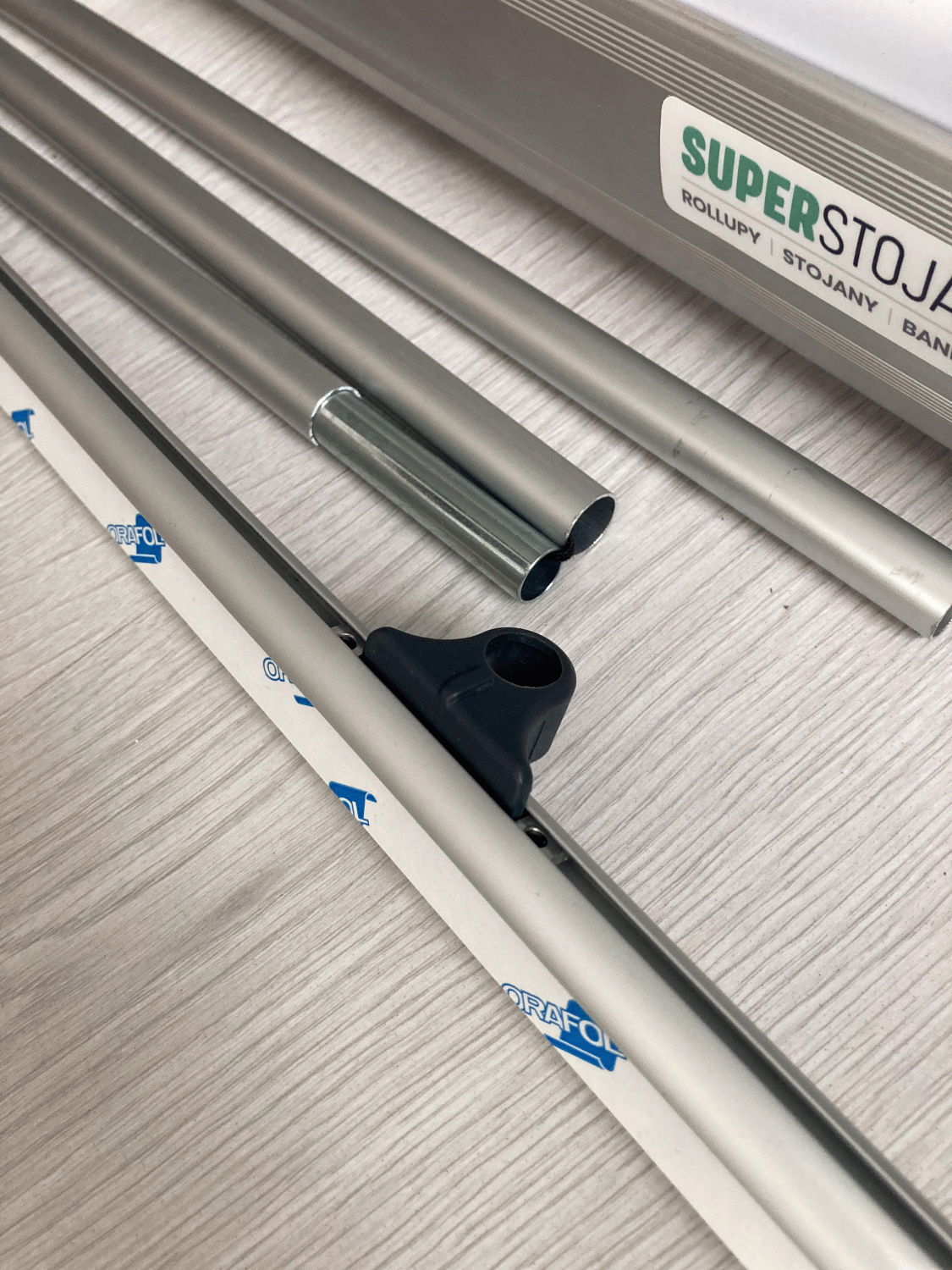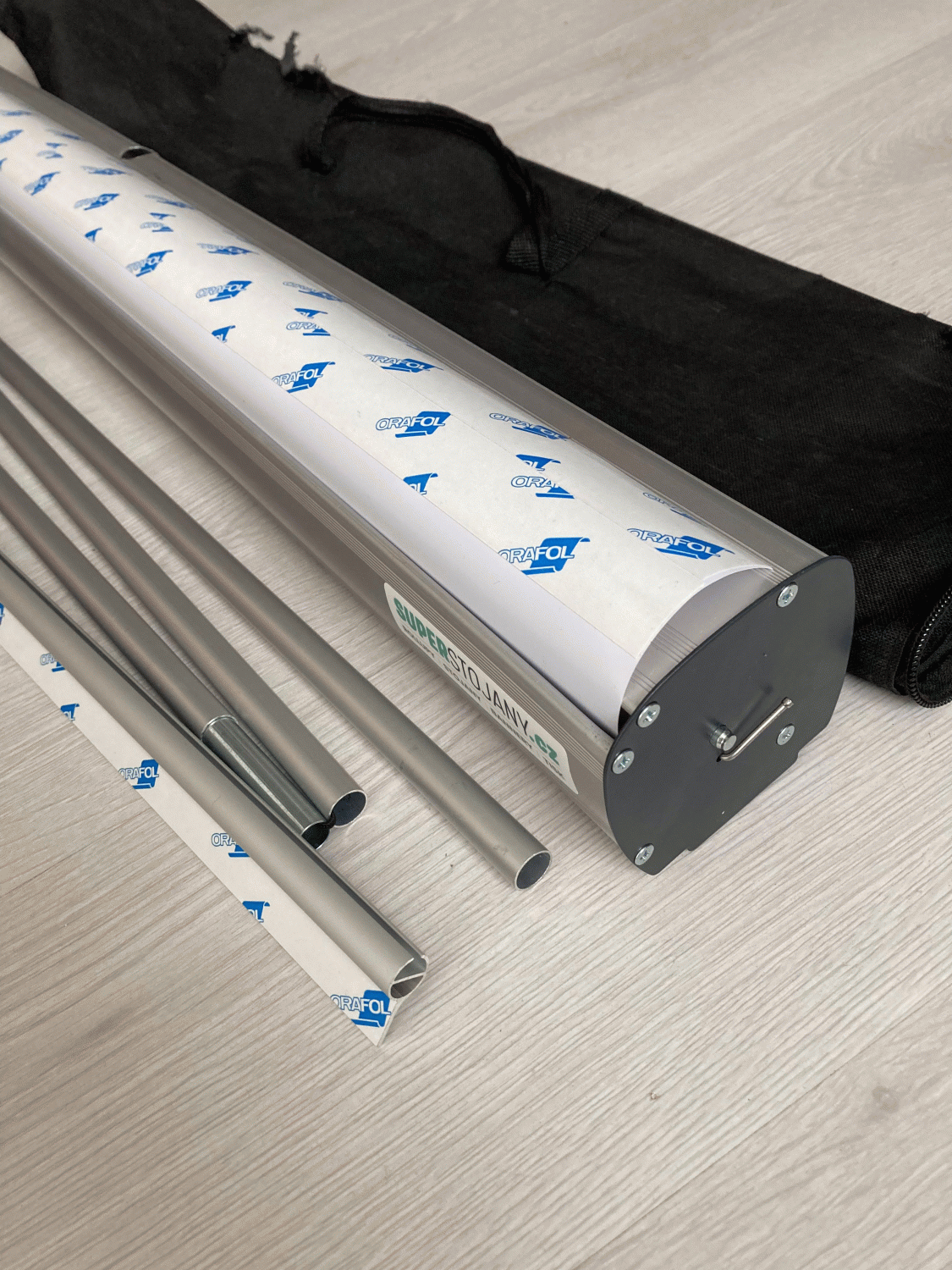 Součástí je rollup systém, lišta, podpěrná tyč a taška.