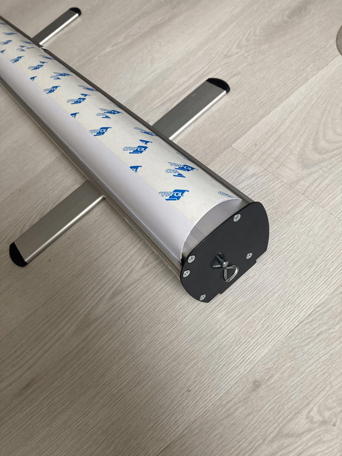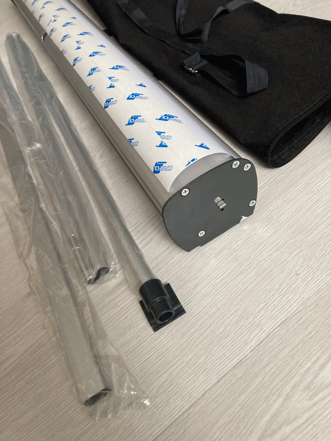 Součástí je rollup systém, lišta, podpěrná tyč a taška.