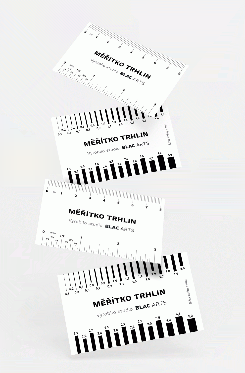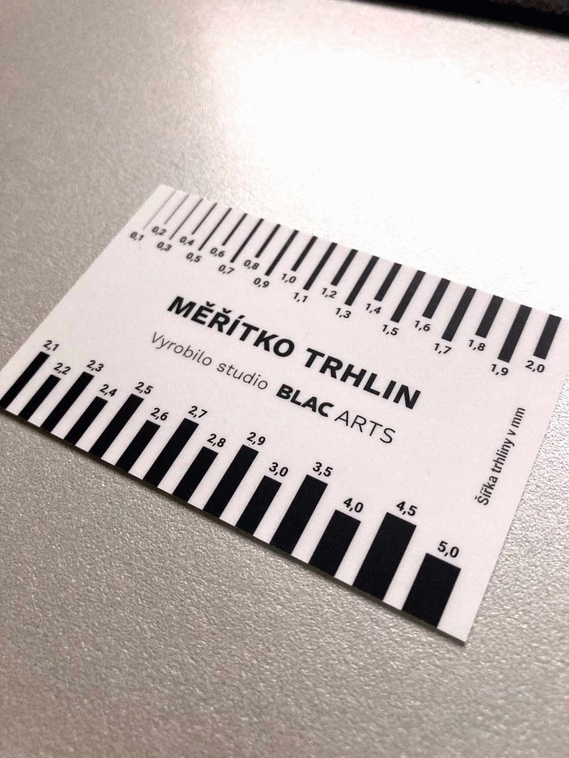 Měřítka trhlin vyrábíme ze speciálního pevného papíru, který oboustranně potáhneme matnou plastovou vrstvou. To proto, aby byly odolnější, ale zároveň aby při focení ve zhoršených světelných podmínkách odrážely odlesky jen minimálně (v galerii je i fotografie měřítek, kde lze vidět matný povrch i eliminaci odlesku). Všechny měřítka řežeme ručně kvůli maximální přesnosti. Výrobek není 100% voděodolný a zároveň nezničitelný.