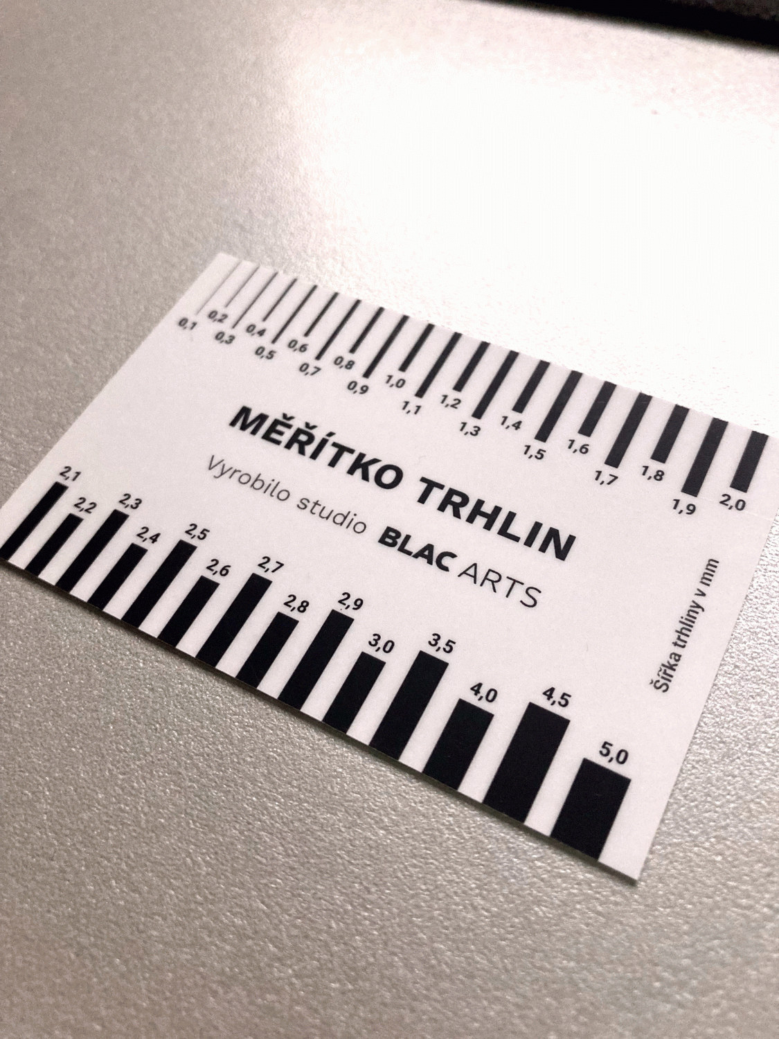 Měřítka trhlin vyrábíme ze speciálního pevného papíru, který oboustranně potáhneme matnou plastovou vrstvou. To proto, aby byly odolnější, ale zároveň aby při focení ve zhoršených světelných podmínkách odrážely odlesky jen minimálně (v galerii je i fotografie měřítek, kde lze vidět matný povrch i eliminaci odlesku). Všechny měřítka řežeme ručně kvůli maximální přesnosti. Výrobek není 100% voděodolný a zároveň nezničitelný.